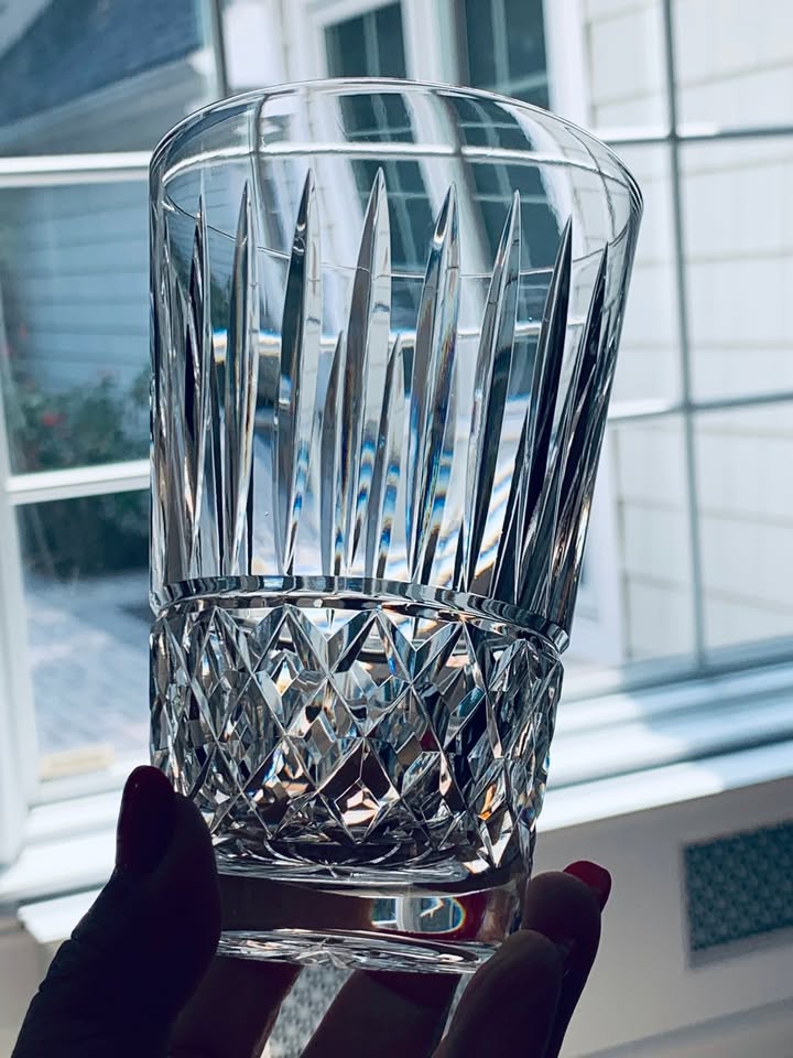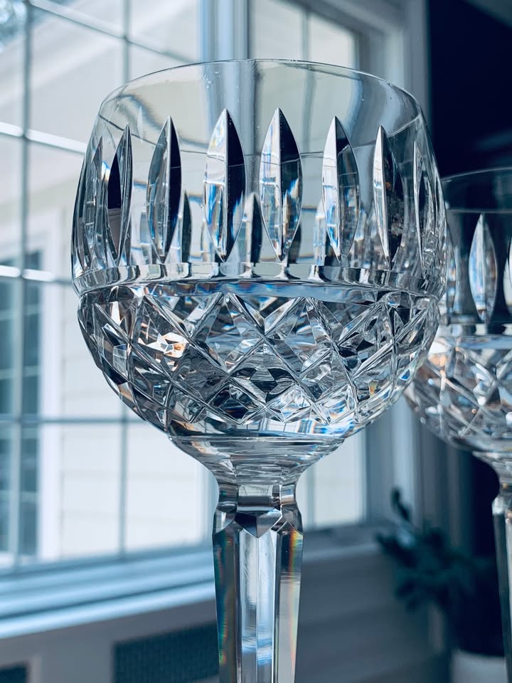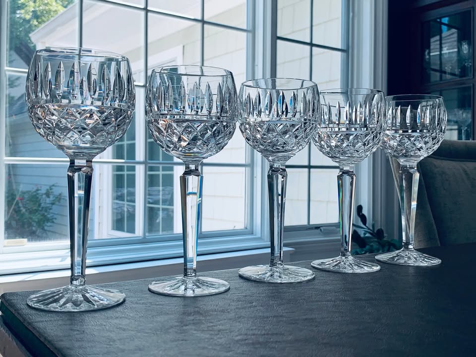 Beautiful vintage Waterford set of 11 hand-cut crystal glasses in the MAEVE pattern. This pattern features deep diamond and vertical cuts with a starburst foot. Made in Ireland. Set includes: 6 – 12oz Flat Tumblers in MINT condition (5″ tall) and 5 Wine Hocks (7.5″ tall) **1 glass has a small nick on foot.