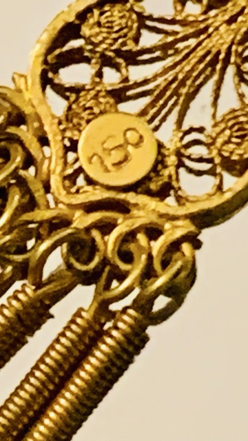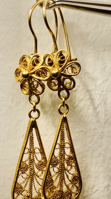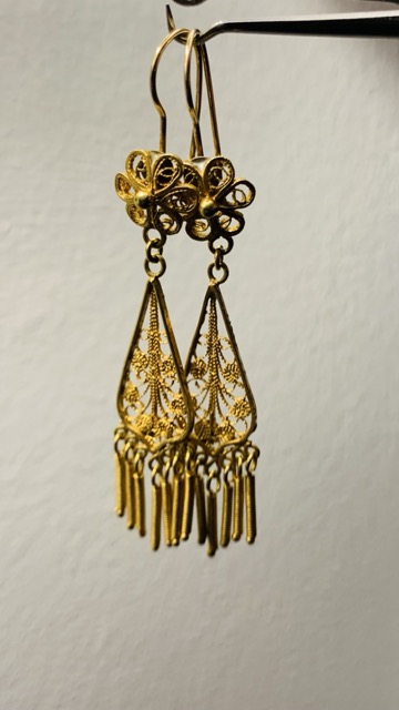 Beautiful antique (late 1800s), solid 18-k gold, filigree tassel chandelier earrings in MINT condition. Intricate design details feature a floral/ball motif at the stud and beautiful floral scroll design capped off by gold fringe/tassels. The openwork design is highly detailed, creating a lace-like appearance from twisted gold wires and small soldered spheres. The aesthetic bridges ancient artistry with 19th-century elegance, offering a sophisticated, vintage look that remains a timeless statement piece.They weigh 6.2 grams and are 60mm in length (approximately 2.6 inches). Each earring is stamped 750 on the back to demonstrate the piece is 75% pure gold (18k/24K=75%). Thereal eye catchers and so unique. You can’t find such pieces today.