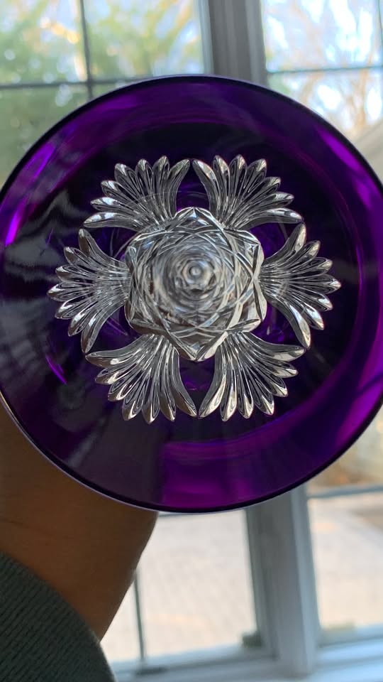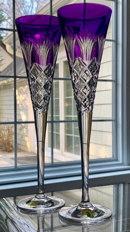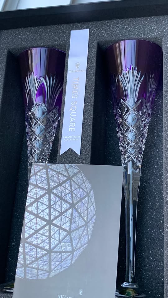 Rare find. Gorgeous pair of Waterford Time Square collection crystal flutes in ultraviolet color; these are new in box and measure 11″ tall. Each signed Waterford and Time Square 2020.