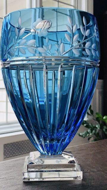 Ajka “Proinnseas” Pedestal Fine Crystal Vase in Blue Topaz; Hand Made in Hungary and Signed