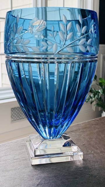 Ajka “Proinnseas” pattern vase in blue topaz color. This vase is a wonderful example high quality Hungarian crystal produced by the renowned Ajka Crystal. The company, founded in 1878, specializes in mouth-blown and hand-cut glass art, which is highly sought after by collectors. This vase stands nearly 11 inches tall and 7 inches wide. It is in excellent condition. This vase is designed with vertical cuts on lower bowl a central band and capped with etched floral motif. Such a striking piece, sure to be the focal point of any space