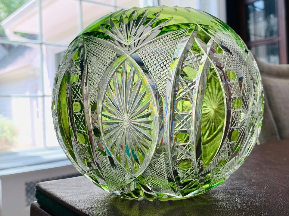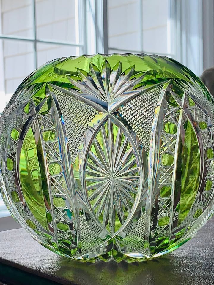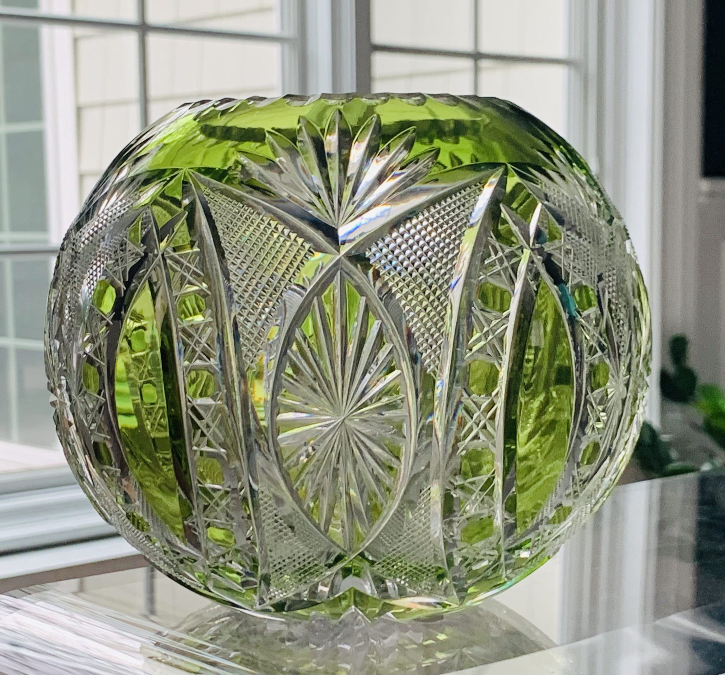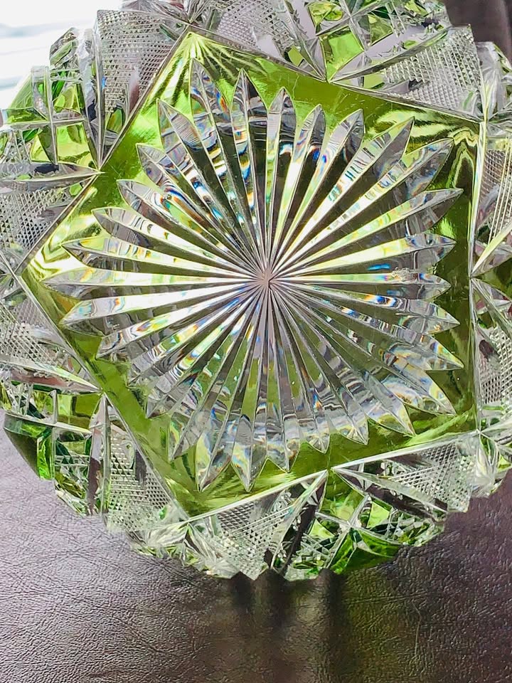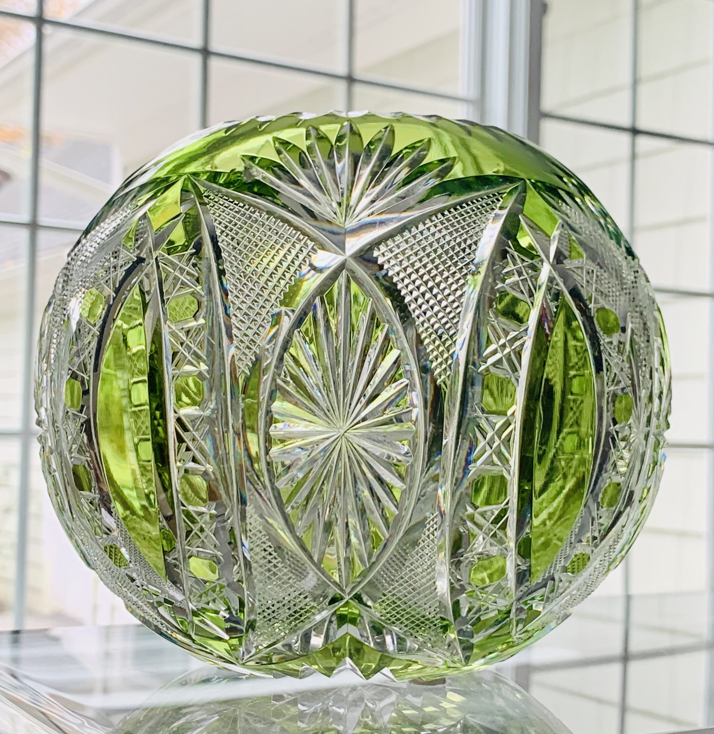 Antique (c. 1900s) Val St. Lambert Brilliant Era Peridot Crystal Flower Bowl; Excellent Condition