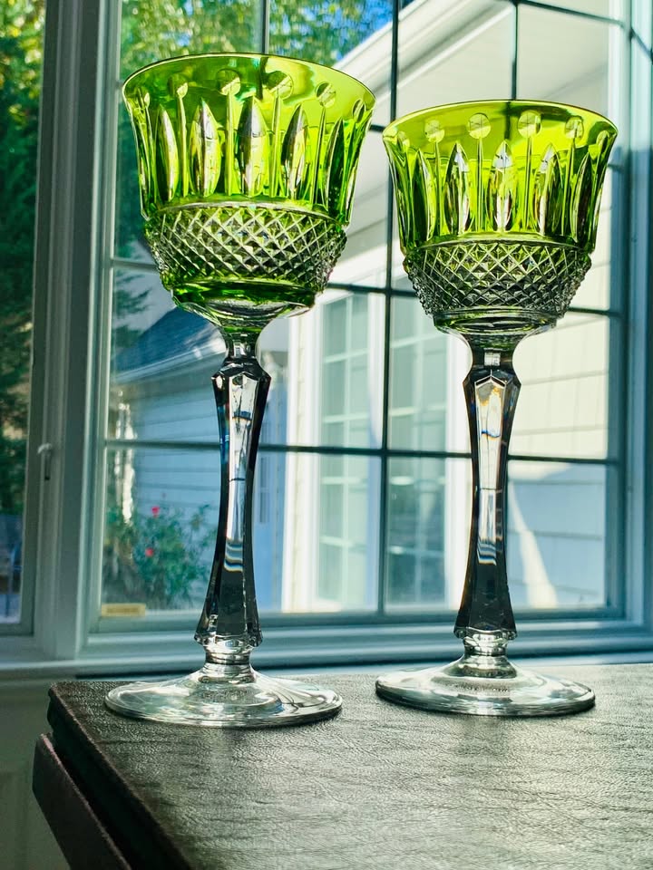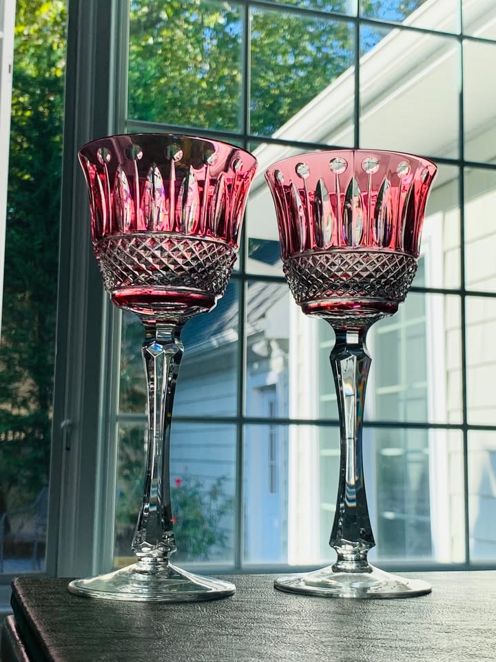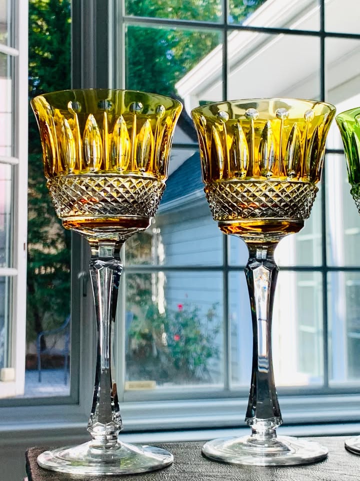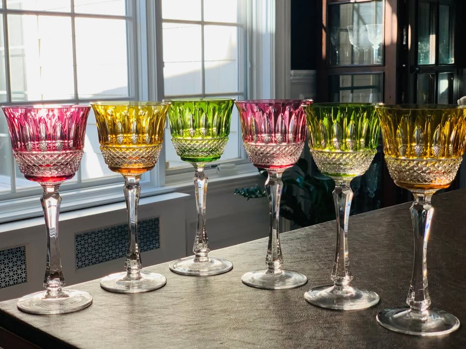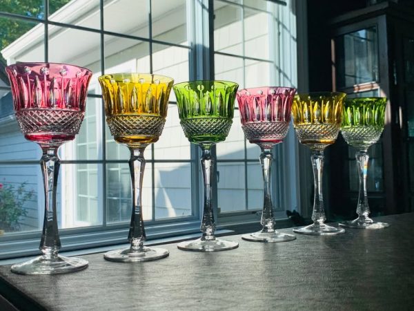Elevate your dining experience with these STUNNING, hand-cut crystal wine glasses from Cristallerie de Montbronn in France. 2 Chartreuse, 2 Cranberry and 2 Topaz. These are in impeccable condition and are approx. 8 1/4″ tall and 3 3/8″ wide.