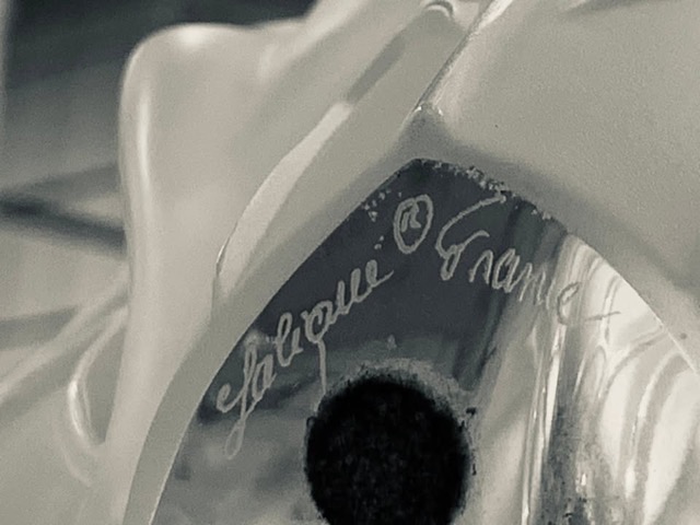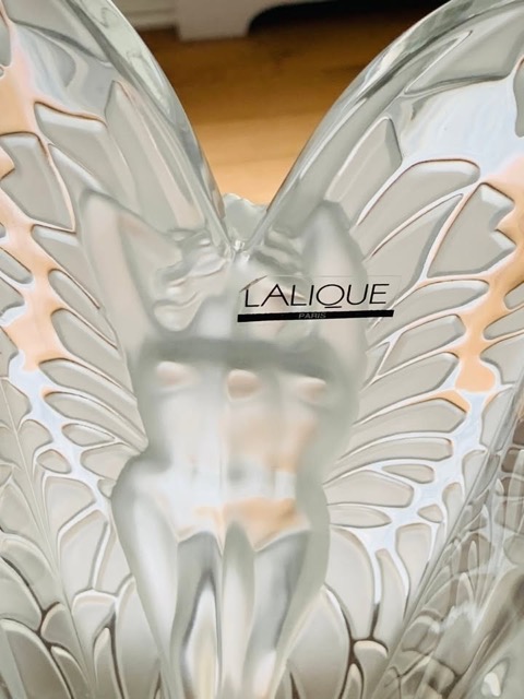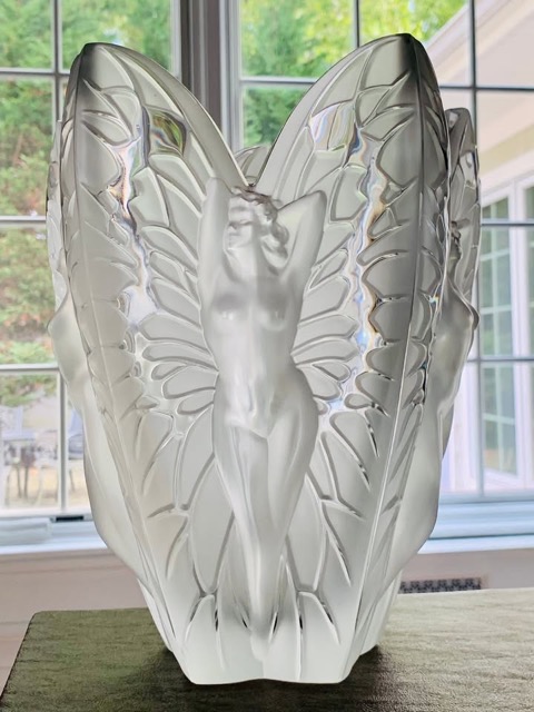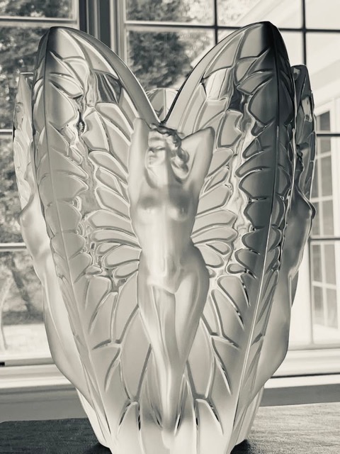 Standing ~11.25″ tall & 9″ wide and weighing 22 pounds, the Chrysalide vase by Lalique is a stunning embodiment of the artistic passions that defined René Lalique’s work. The design gracefully intertwines elements of flora with the elegant contours of the female form, evoking both natural beauty and timeless femininity. Crafted in satin-finished and polished crystal, the vase captures the delicate interplay between nature and sensuality—a theme central to Lalique’s creative vision. Petal-like folds and flowing lines suggest a chrysalis on the verge of transformation, symbolizing renewal and the profound connection between the natural world and human artistry. This vase stands as a luminous tribute to Lalique’s enduring fascination with organic motifs and the sculptural allure of the female silhouette, making it a true collector’s piece and an exquisite accent for any interior.