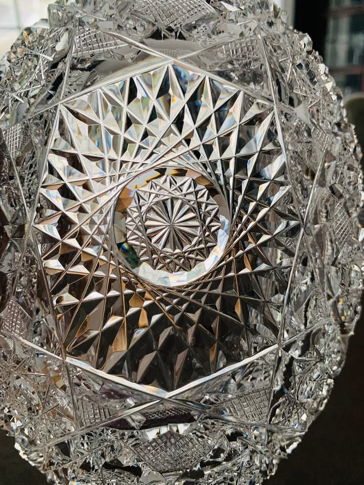 This beautiful oval fruit bowl from American Brilliant Period (1876-1917) is 11 inches in length and 8.25 inches wide and 4.5 inches tall. It is decorated with hobstars within each circle and anchored by a larger hobstar in the center of the bowl which all form a Star of David pattern on underside. There are a few minor nicks to saw tooth rim but overall excellent condition.