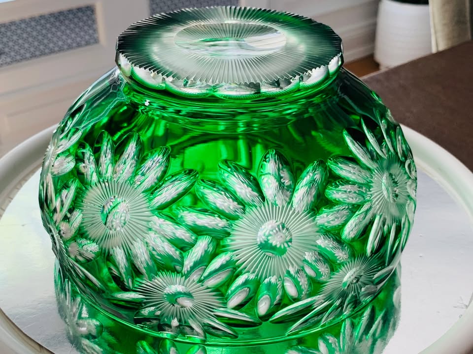 Absolutely beautiful, vintage Bohemian crystal bowl cut to clear in vibrant emerald green. Daisy pattern. Heavy, nearly 4 pounds. Measures 7.25″ wide and 4.25″ tall.