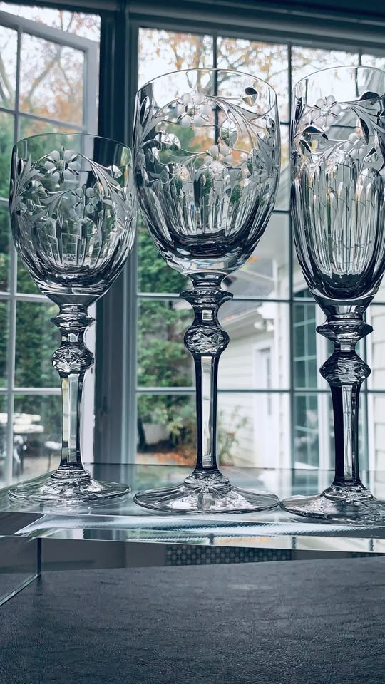 A rare opportunity to own a stunning set (27 TOTAL: 12 Water Goblets, 11 Wine and 4 Flutes) of highly sought-after stemware in “Country Garden” pattern by Rogaska. Rogaska is renowned for producing high-quality, brilliant crystal that exudes sophistication and grace. Their intricate craftsmanship (mouth blown/hand cut) and elegant, traditional style translate to timeless sophistication for any table setting or home bar. The “Country Garden” pattern features a deep-cut floral and panel design on the bowl, a beautifully faceted multi-sided knob/stem and a decorated base. Measurements: Water (8.75″), Wine (7.75″) and Flute (8.75″). Each glass is signed and in impeccable condition.