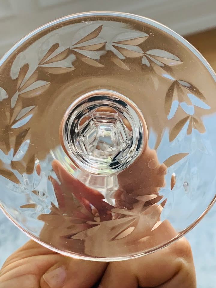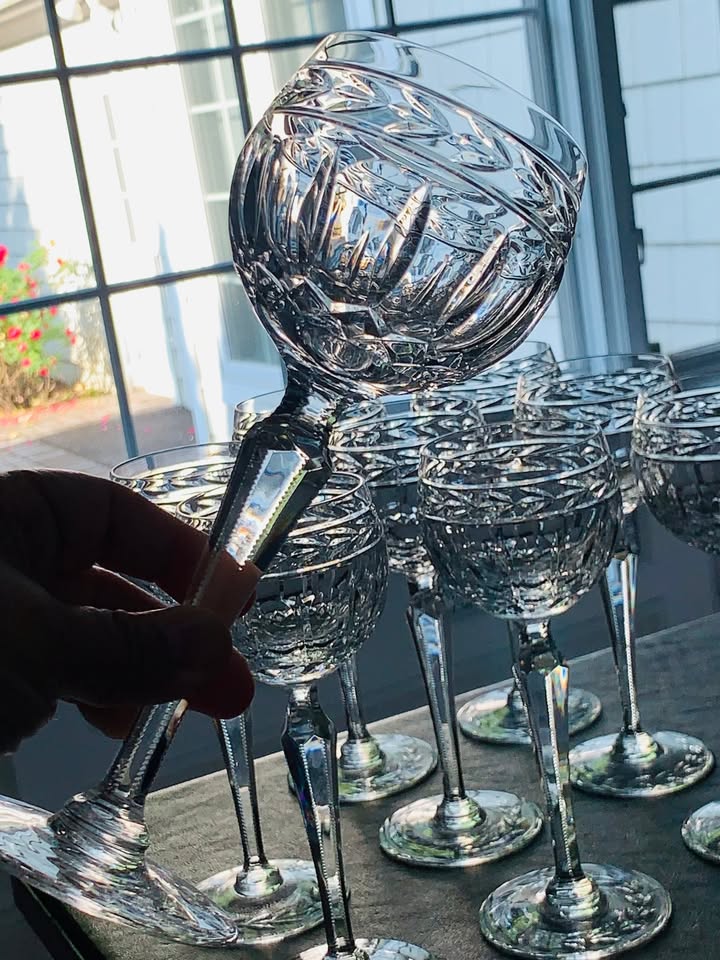 With a history spanning over 350 years, Rogaska has established a global reputation for producing fine crystal, Rogaska products are still predominantly handmade, with skilled blowers, cutters, and engravers employing centuries-old glassmaking techniques passed down through generations. INCREDIBLY HARD TO FIND, this set of 9 crystal wine hocks are in IMPECCABLE condition. Each glass is decorated with a laurel leaf border on upper bowl, a circular pattern of wedge cuts and multi-facted zippered stem with a base decorated with laurel leaf. Hand made in Slovenia.