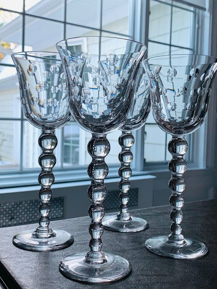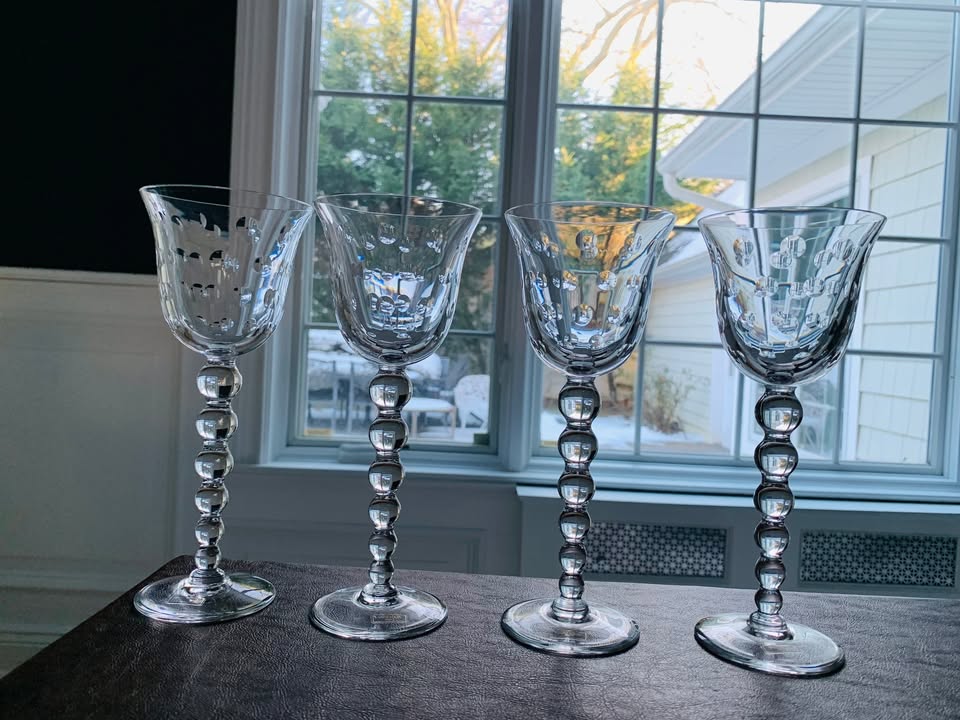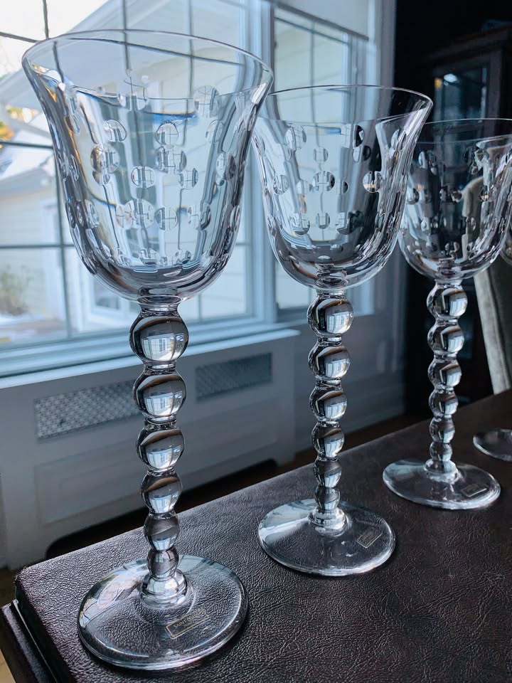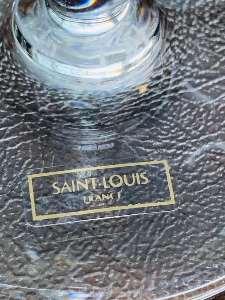 Saint-Louis is the oldest crystal manufacturer in Europe, in existence for over 400 years and known for their superior quality and designs. This is a set of 4 new, never used wine glasses in the “Bubbles” pattern. Each measures 8 1/4 inches high and is decorated in circle cuts with bubble stem. Each glass has Saint-Louis sticker and signed on the underside of the base.