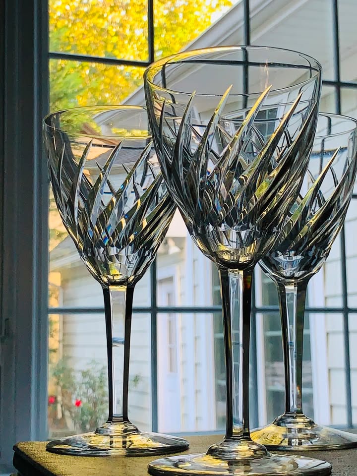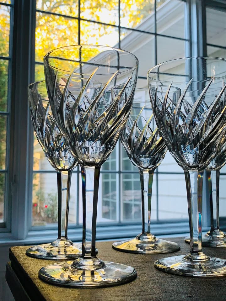 Gorgeous set of elegant, high-quality crystal wine glasses by renowned Cristallerie du Val St. Lambert in Belgium. Beautiful swirl cut design, clarity and nice weight to them. Each glass is signed and measures 7 5/8″ tall and 3.75″ wide. Have 5 matching sherry glasses which I will provide for free w/purchase.