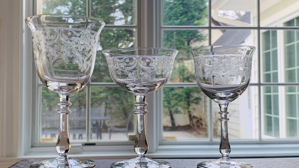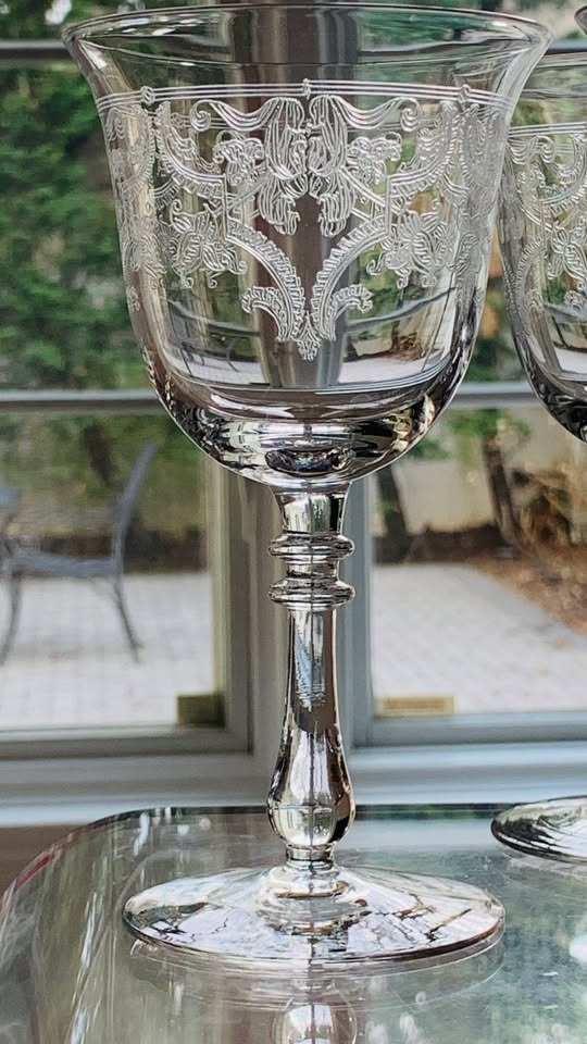 Gorgeous set of 1920s BRYCE Brothers, pattern 784-6, floral swag etched glasses in MINT condition. Set includes: 12 Water/Wine Goblets (6.75″ tall) 4 Sherry (5 3/8″ tall) 4 Cocktail (5 1/4″ tall)