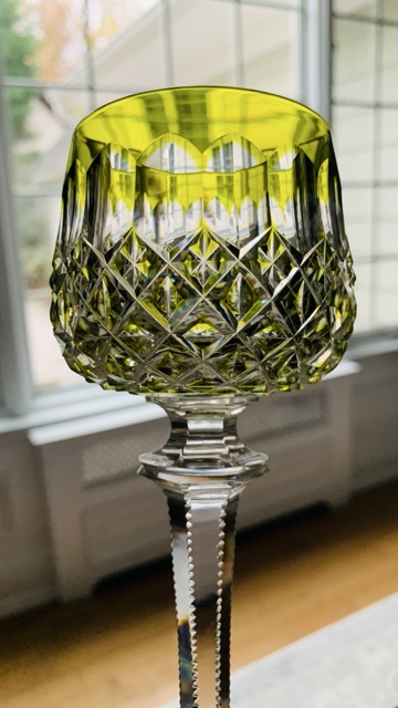 Exquisite antique (pre-1930s) Baccarat wine hocks in a gorgeous chartreuse color and in pristine condition. Hand crafted in France.