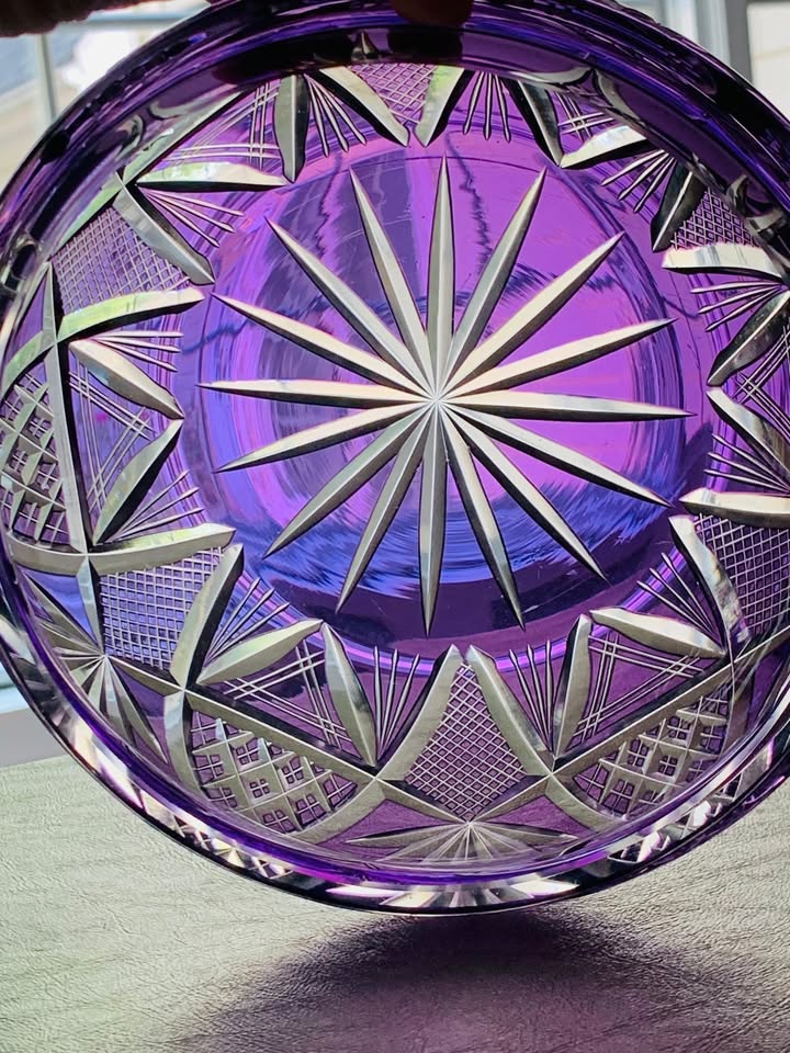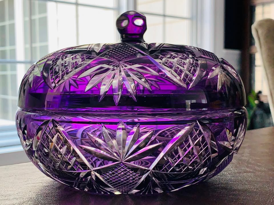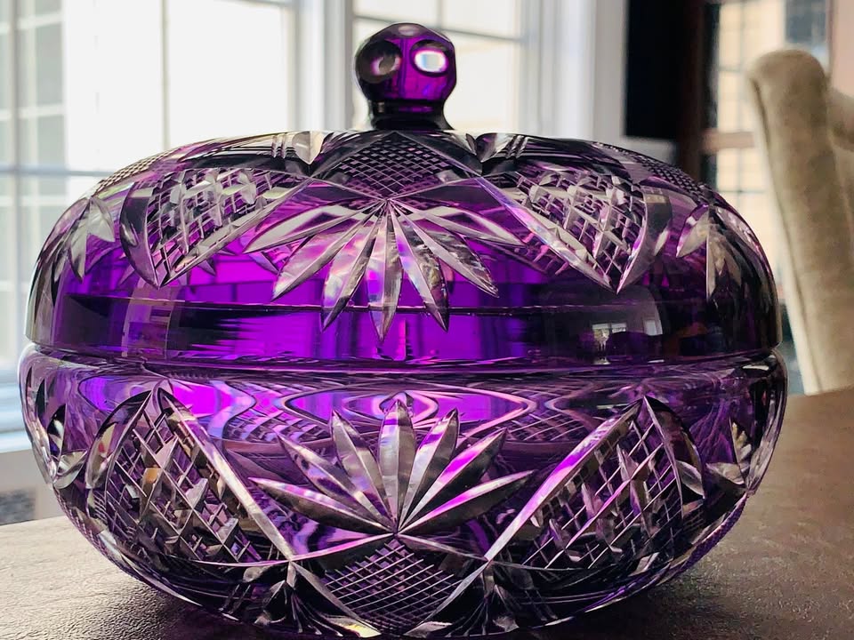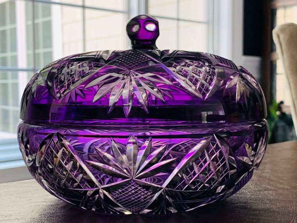 Stunning Bohemian Crystal Bowl w/Lid – Purple; Hand Carved w/Strawberry Diamond Fan Motif; MINT