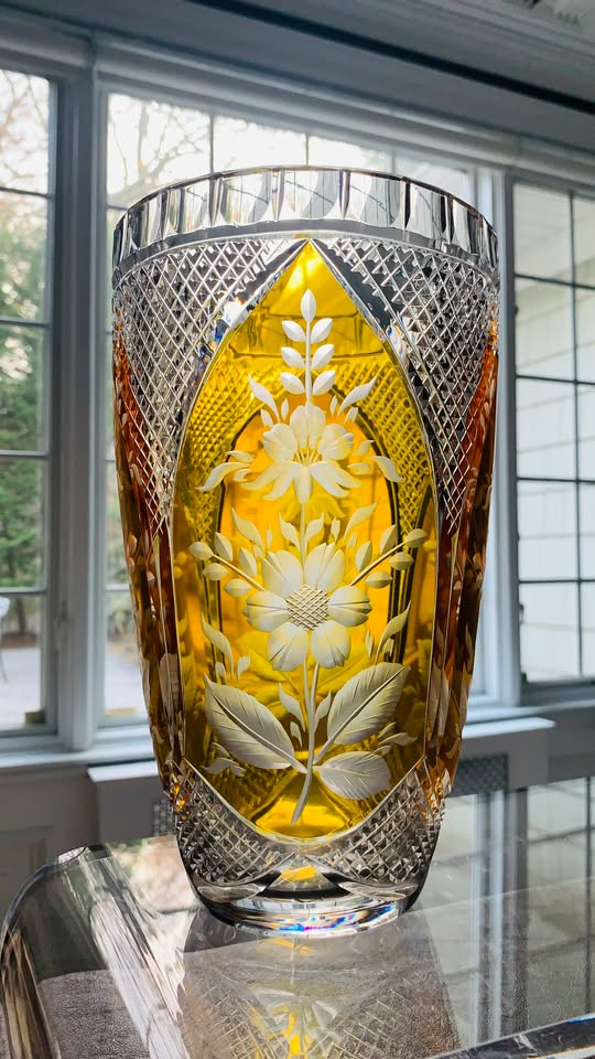 Stunning Citrine/Amber Crystal Vase w/Engraved Floral Motif; 10” x 6.25”; MINT Condition