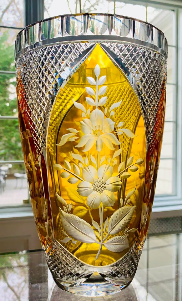 Magnificent mid-20th century citrine/amber cut-to-clear large vase with floral motif. The vase is a product of traditional European craftsmanship, involving intricate hand-cutting and deep floral engraving on amber-overlay, a process emphasized by several glass manufacturers in the region. This beauty stands 10” tall and has a 6.25” opening, weighing nearly 6 pounds. This piece is sure to brighten any space. Normal wear to the base, otherwise in pristine condition. Julia Glassworks dates back to 19th century with ties to German glassmaker Josephine Glassworks but post WWII it came under Polish authority.