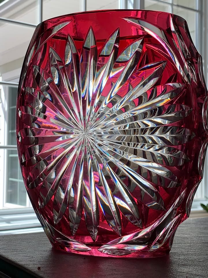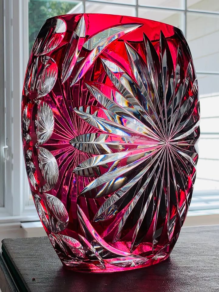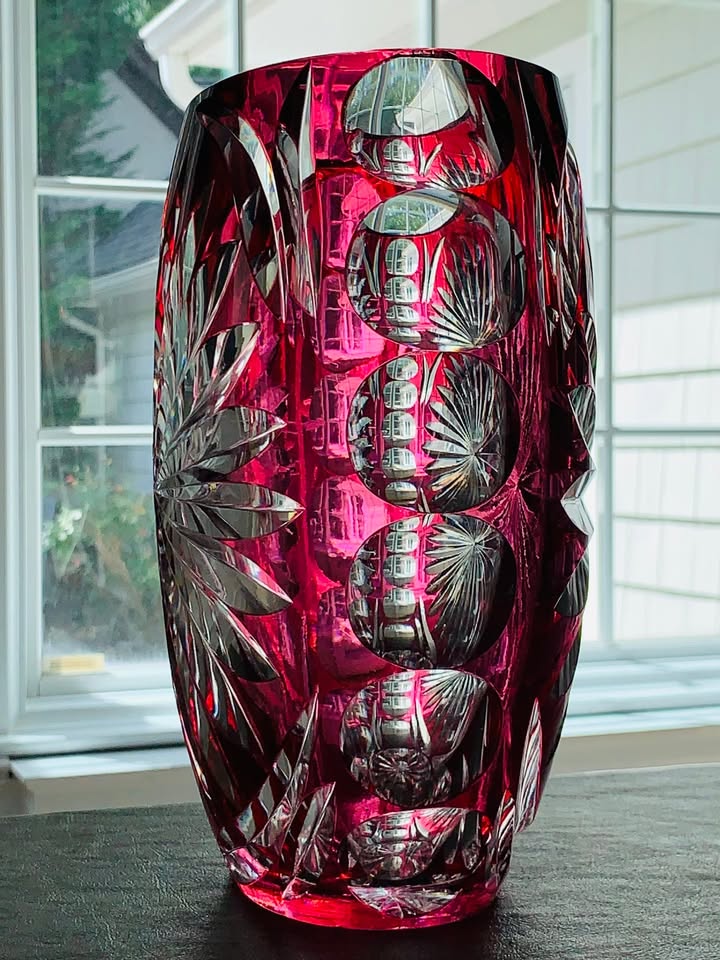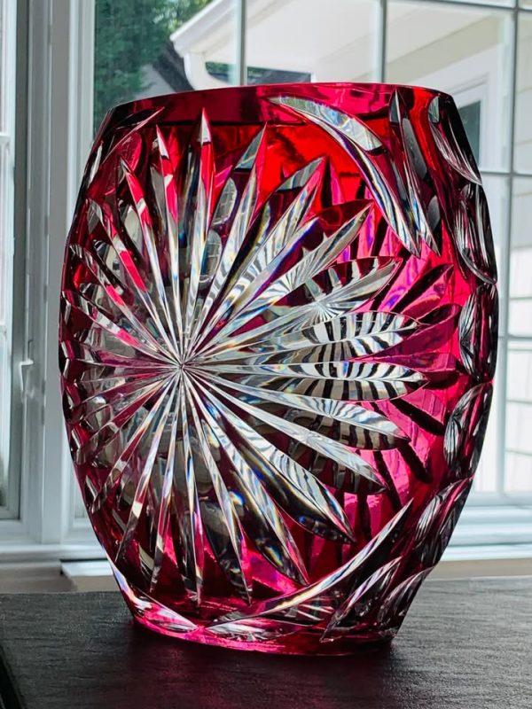 Vintage (1950s) Val St. Lambert Cranberry Hand Cut-to-Clear Large Vase
