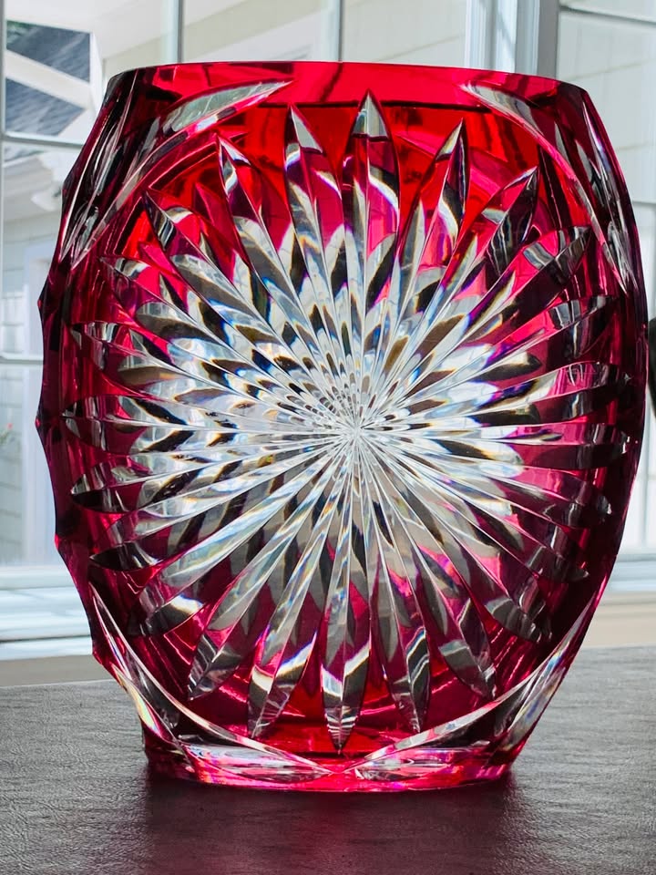 Dazzling! Own a piece of history from world renowned Belgian Cristallerie Val St. Lambert. With a legacy dating back to 1826, VSL is synonymous with exceptional quality crystal and iconic designs. This Val St. Lambert vase is not just a decorative item – it’s an heirloom that will transcend time. The intricate cut-to-clear design will have you mesmerized by the play of light through the meticulously crafted geometric patterns and starburst motifs, a hallmark of Val St. Lambert’s mastery. This piece is from the mid-20th century and measures nearly 11 inches tall, has a 7 inch opening and a circumference of 23 inches around the middle. MINT condition and signed (and heavy). A true piece of art glass.
