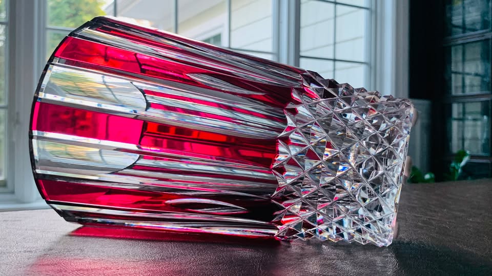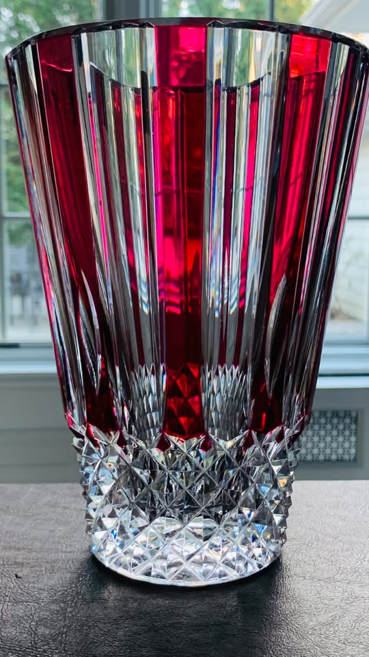 Vintage 1960s Val Saint Lambert Art Deco Cranberry Crystal Diamonds/Stripes Vase; 8 3/8″ Tall; MINT
