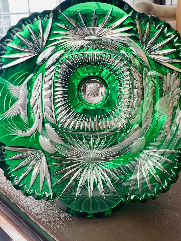Czech art glass at its finest in this flawless, stunning emerald green, cut-to-clear and etched pedestal vase featuring game birds, starbursts, fan/wedge/circle cuts. This lovely vase stands 11 3/8″ tall and has an opening width of 7 inches. The rim features both scalloped and sawtooth design and it sits on a square pedestal based with a cut foot.