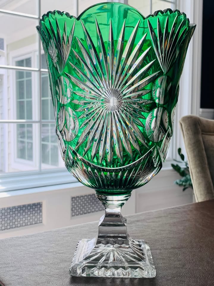 Vintage Bohemian (Czech Republic) Emerald Pedestal Vase; 11 3/8″ Tall, 7″ Opening