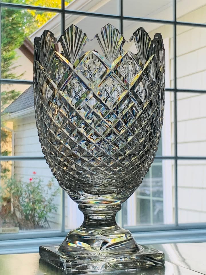 Incredible skill and artistry are featured in this vintage Waterford master cutter Urn shaped pedestal vase. Magnificent in every way, this vase stands nearly 11 inches tall and 7 inches wide. Hand cut with graduated diamond cuts leading to a scalloped rim of fan cuts which all come together for an incredible play of light. It sits on a square pedestal which/gothic signature. Made in Ireland. Mint condition.