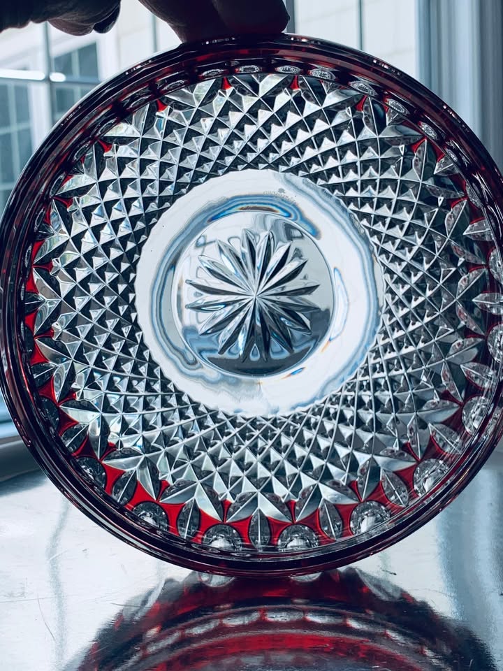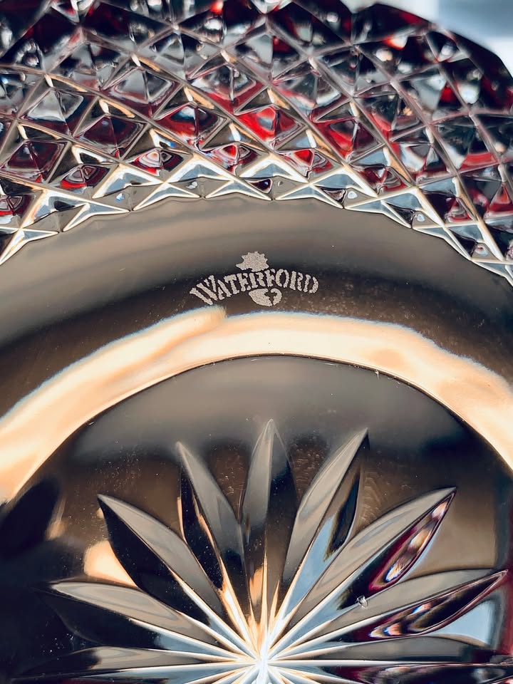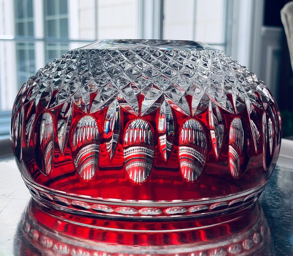 Striking, deep ruby colored crystal bowl by Waterford in the Clarendon pattern. It is mouth-blown and hand-cut, showcasing the intricate details of the Clarendon pattern. The design features a combination of oval, fan, and crosshatch cuts. This gem measures 6 inches in diameter and approximately 3.5 inches tall. Excellent condition, no chips or cracks or flea bites.