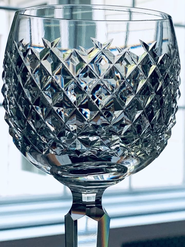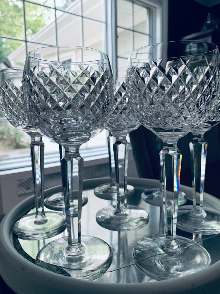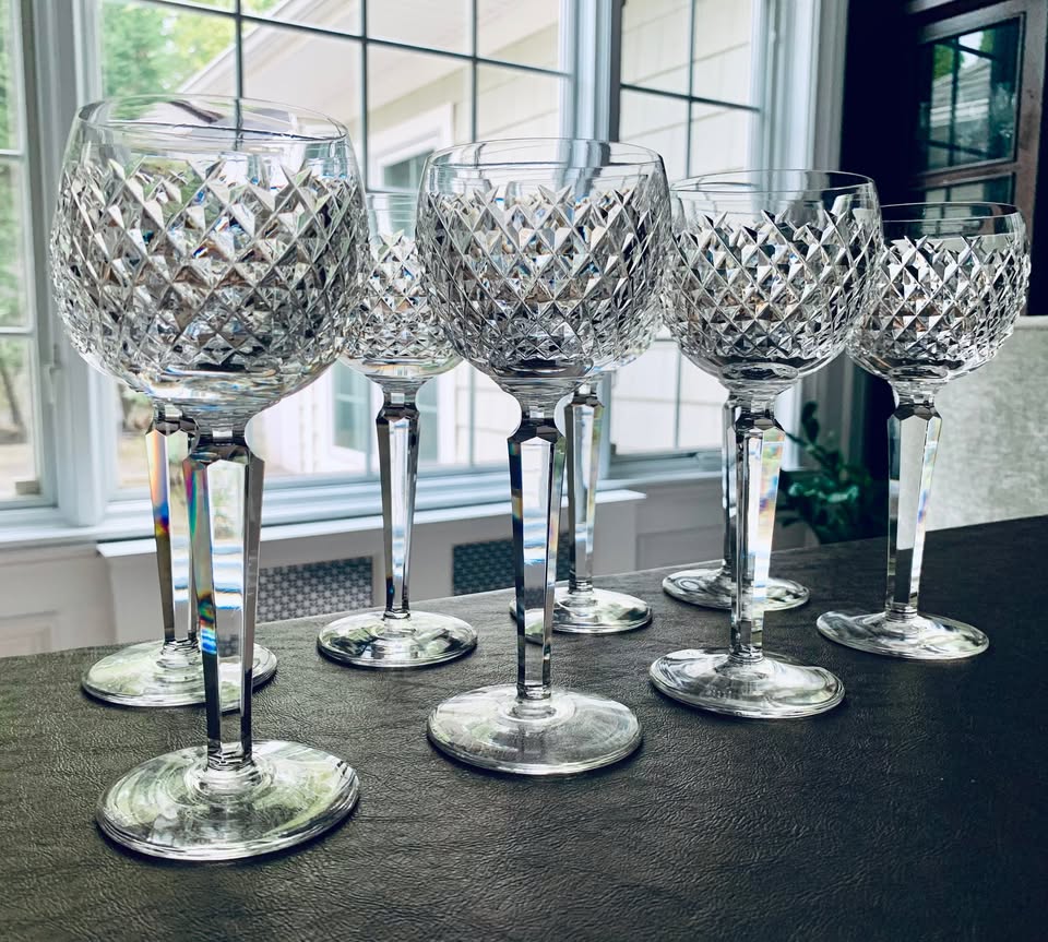 Vintage yet like new. Set of 15 pristine/like new condition Waterford Alana wine hocks. Standing 7 3/8 inches tall, these glasses are decorated in a cross-hatch pattern, glistening with brilliance and feature a multi-faced stem with a plain foot. Gothic signature on each glass. Amazing clairty and condition is like new. Made in Ireland.