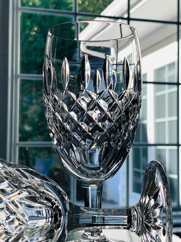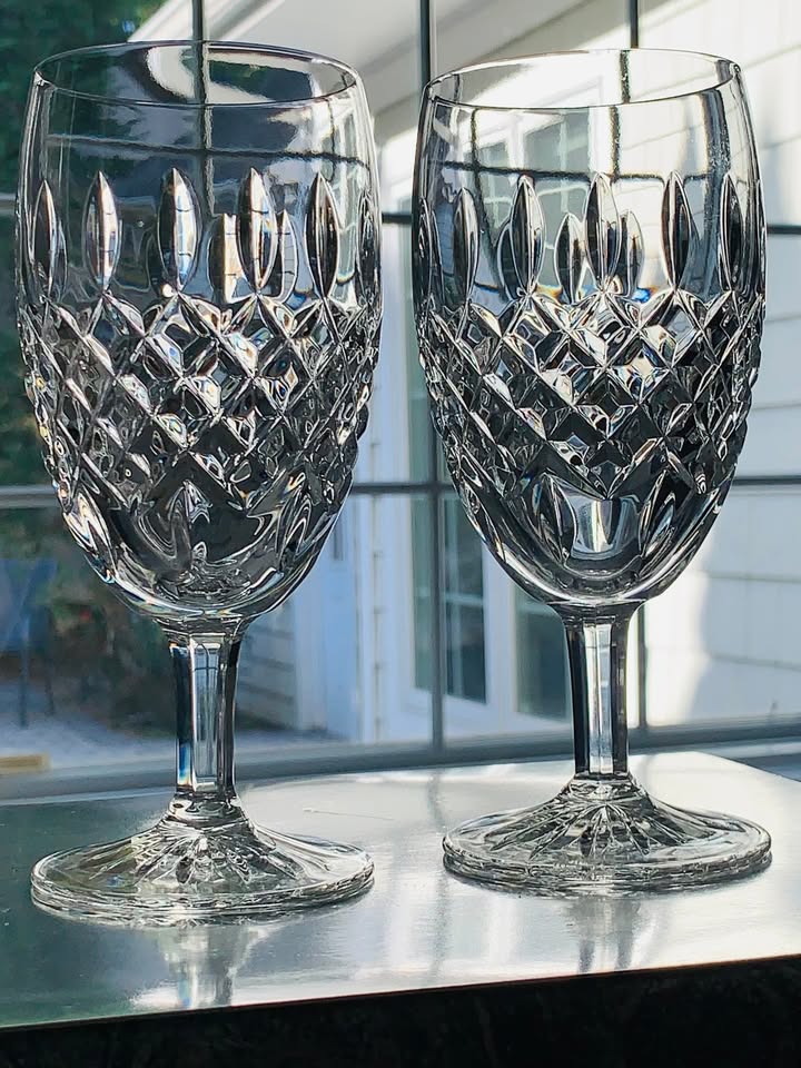 BRAND NEW IN BOX – Set of 4 stunning Waterford iced beverage glasses in original wrapping and box (several boxes available). Each has gothic signature on base and measures approximately 7 inches tall by 3 inches wide. Beautiful diamond pattern around bowl w/wedge cuts on top. Faceted stem with starburst foot. A great wedding gift or addition to your home for an elevated drinking experience.