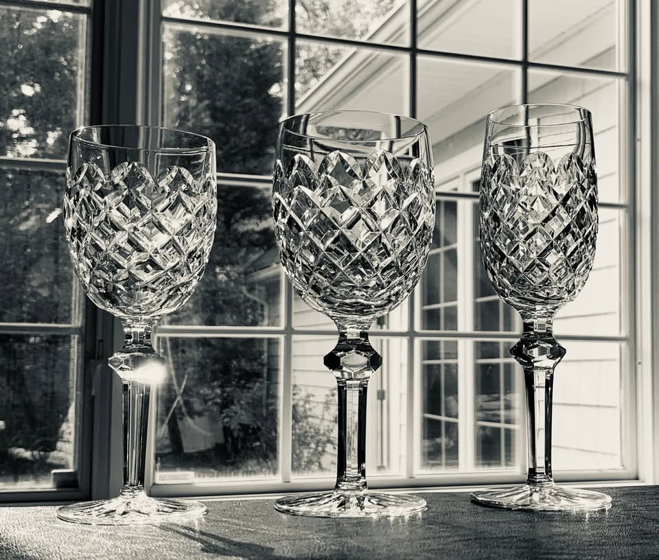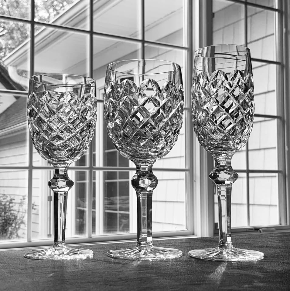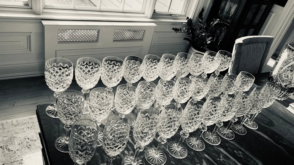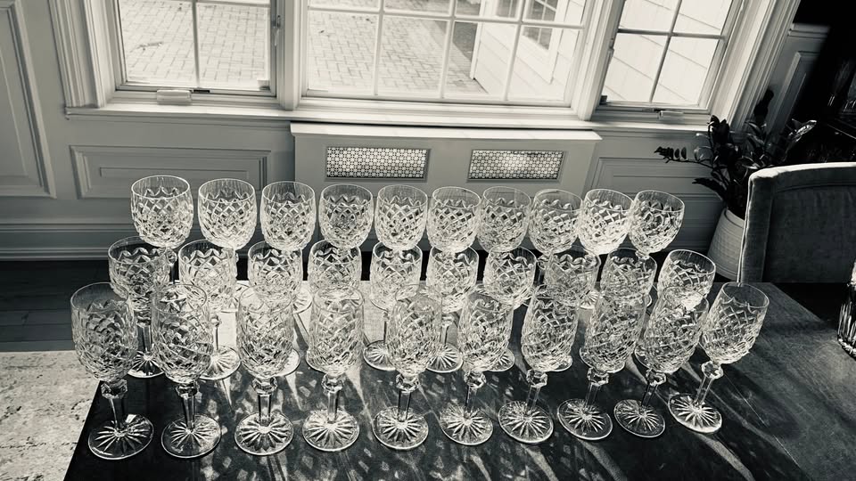 A Legacy of Brilliance: An Exquisite 30-Piece Crystal Collection. Own a magnificent, comprehensive set of crystal stemware by Waterford in the “Powerscourt” pattern, the pinnacle of all Waterford patterns (in my opinion). Each piece, hand cut by skilled artisans with diamond and criss-cross cuts that capture and refract light with unsurpassed brilliance. This is a rare opportunity to acquire a complete service for ten, ensuring every occasion, from intimate dinners to grand celebrations, is elevated to an extraordinary event.