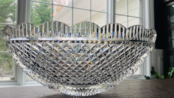 Hand cut in Ireland but Waterford master cutter, this gorgeous oval bowl / “boat” bowl is designed with intricate diamond and vertical cuts. This beauty measures 13″ long, 6.5″ wide and 5.25″ high. It two minor flea bites to scalloped rim, though not noticeable otherwise in mint condition. Signed with gothic acid etched signature to the underside. A terrific centerpiece or fruit bowl.