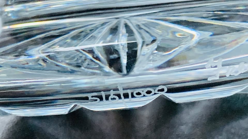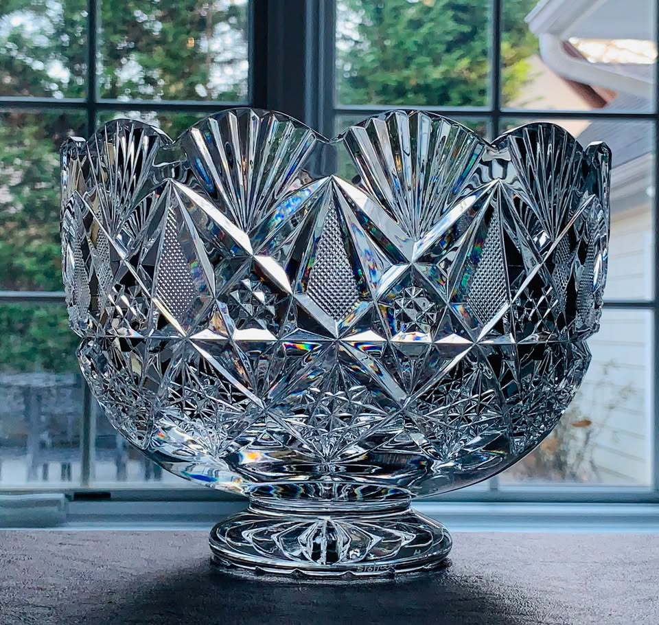Gorgeous Waterford Society, 1997 limited edition Sinclaire Centerpiece bowl, number 516 out 1000. A stunning example of master craftsmanship designed and signed by prominent Waterford designer Fred Curtis. This collector’s piece is hand cut, sitting on a pedestal base and features a classic yet contemporary “Sinclaire” pattern. The design is characterized by intricate diamond cuts across its body, complemented by scalloped fan motifs along the rim and hobstars around lower bowl. Great interplay of light in this elegant centerpiece. Measures 9 inches wide by 7 inches tall. Made in Ireland.